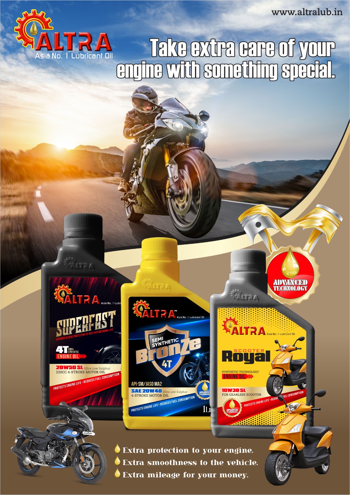 Altra Bronze 4T motorcycle oil is blended with Ultra Low Sulphur Base oils and time Tested additives to derive maximum performance. Further it is fortified additional Admixtures to improve on specific areas such as countering excessive engine heat Increasing thermal stability for longer drain period, thus avoiding oil thickening and Sludge formation.
